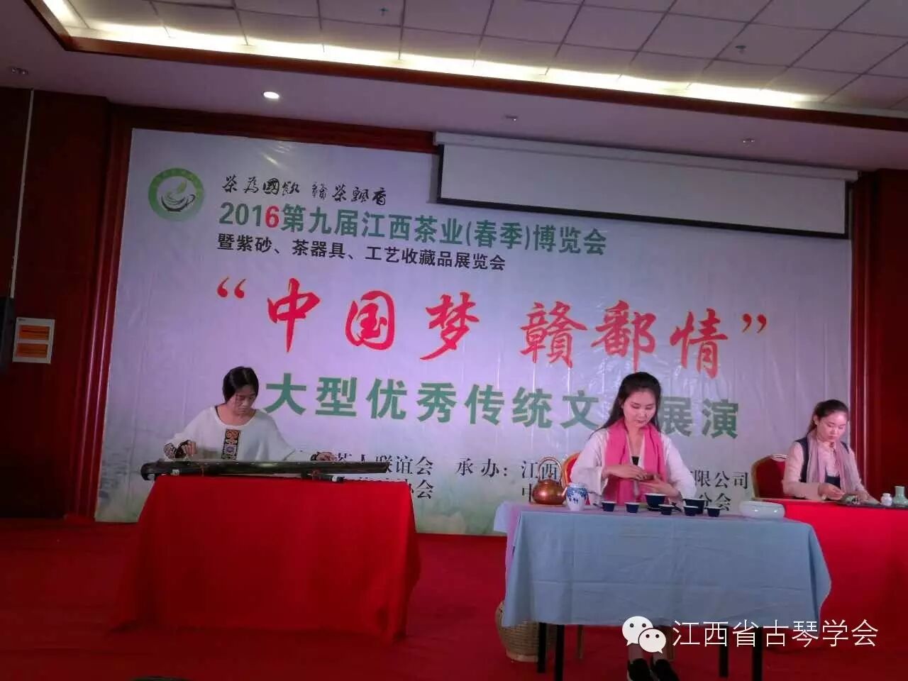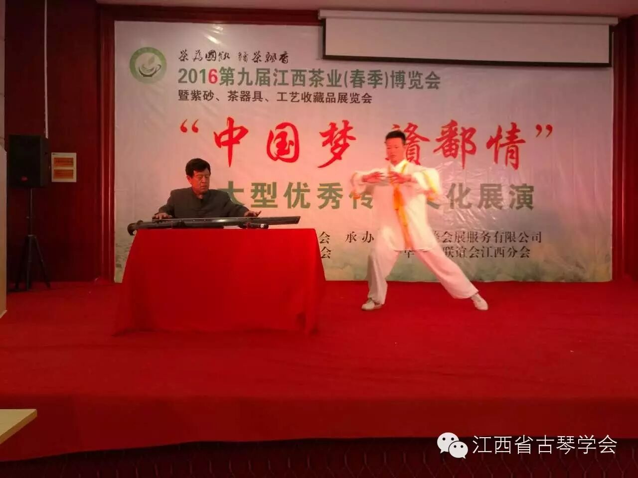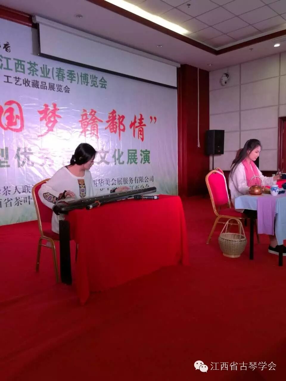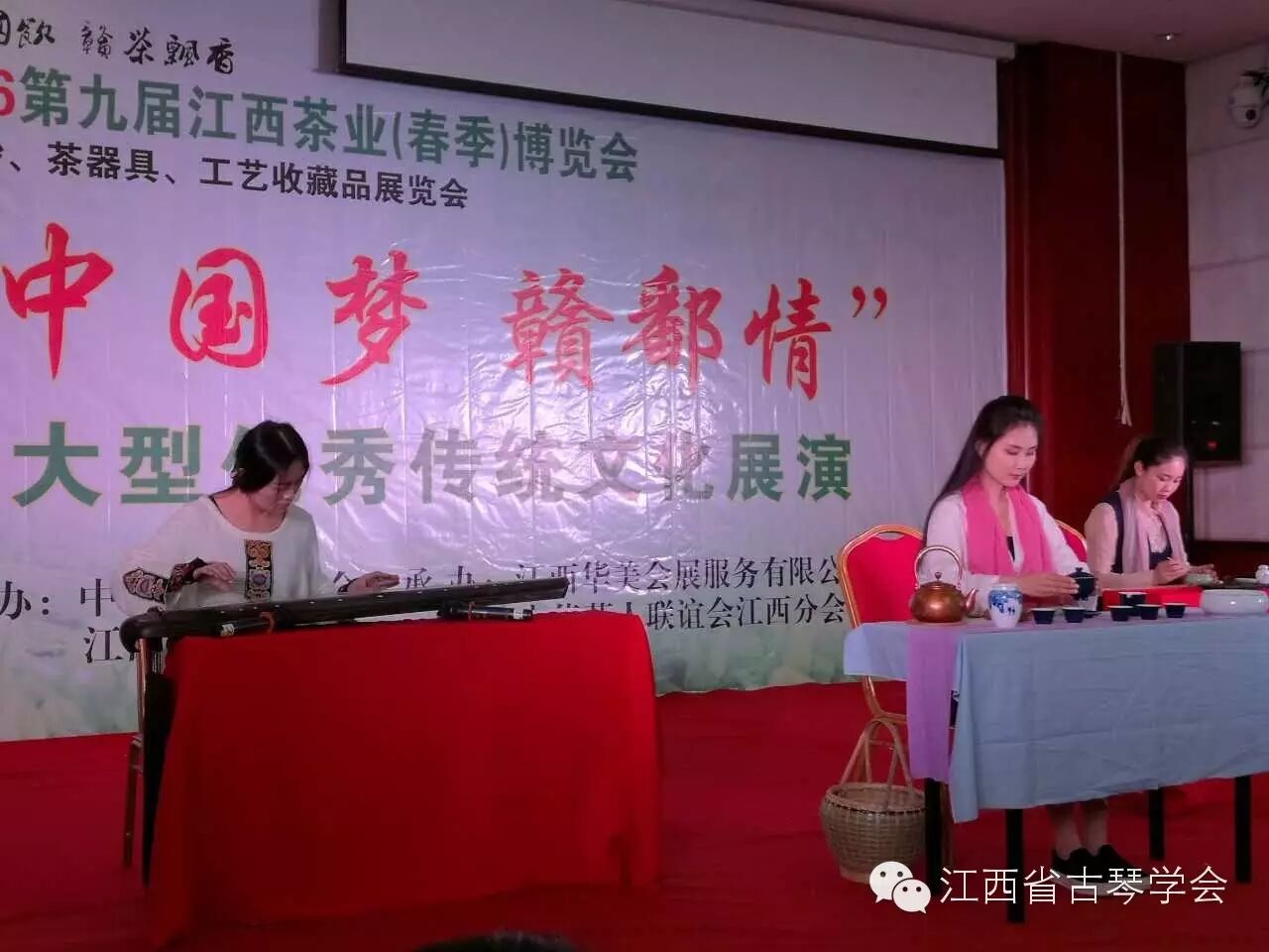 江西茶业博览会大型优秀传统文化展演会上,江西省古琴学会与滕王阁青霜茶轩合作,闻香抚琴,琴茶一味。